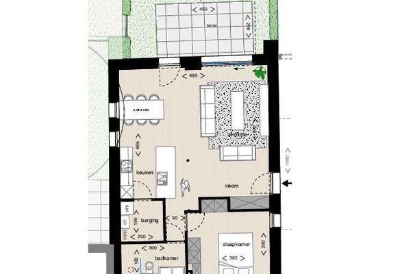 Inkomhal, woonkamer met open keuken, berging, 1 slaapkamer, badkamer, terras en tuintje