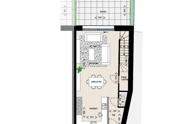 Gelijkvloers: Inkomhal, apart toilet, woonkamer met open keuken, terras en tuin.
