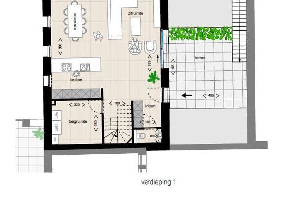 1ste verdiep: Inkomhal, apart toilet, woonkamer met open keuken, berging en terras