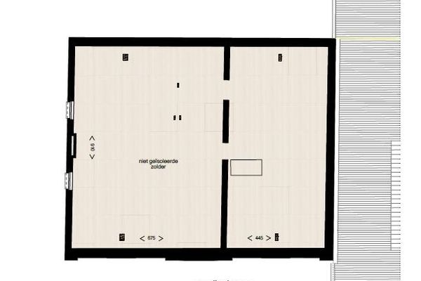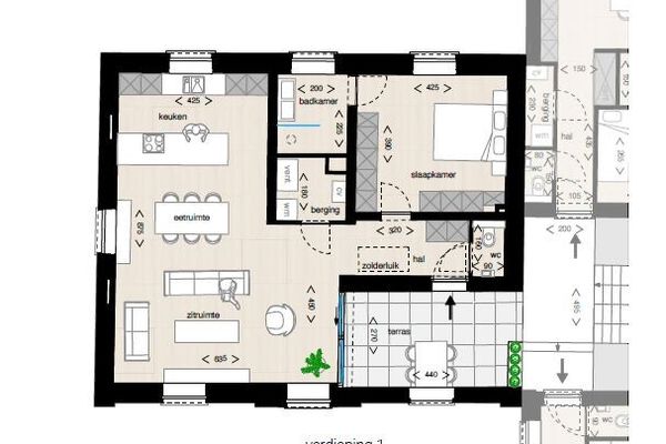 Verdiep: Inkomhal, apart toilet, woonkamer met open keuken, 1 slaapkamer, badkamer, berging, zolder en terras.