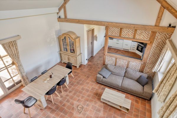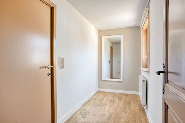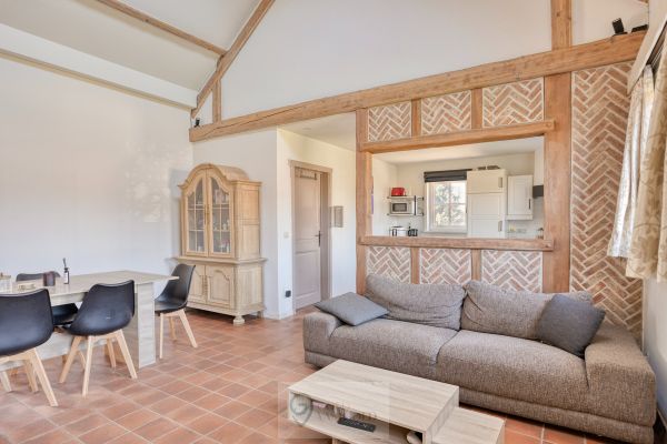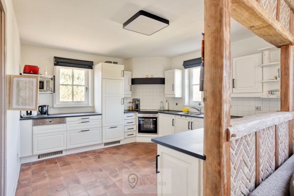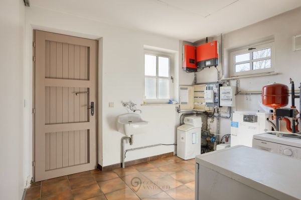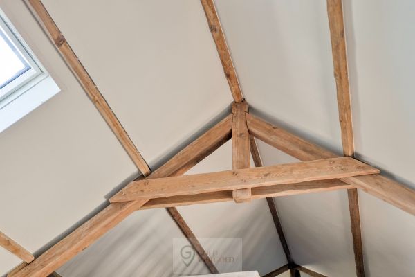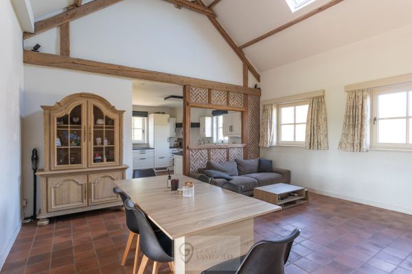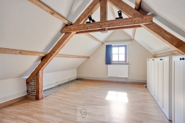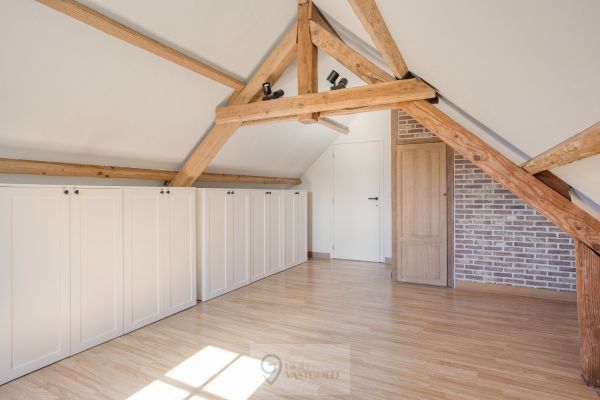 De inkomhal bevindt zich centraal en leidt naar de verschillende ruimtes in de woning. Bij het betreden van de woonkamer valt authenticiteit direct op door het hoge plafond en de gezelligheid van het hout. Deze ruimte is open tot aan het dak wat zorg voor een vrij gevoel. Verder is de keuken gelegen. Deze is voorzien van een inductiekookplaat, oven en vaatwasser. Aan bergruimte geen gebrek, want achterin de keuken zit een berging waar wasmachine, droogkast, een extra frigo, etc. zeker een plekje vinden. Alsook is hier een ingebouwde kast waar boodschappen of andere benodigdheden opgeborgen kunnen worden. Met de uitklapbare trap kan de zolder, gelegen boven de keuken en berging bereikt worden.