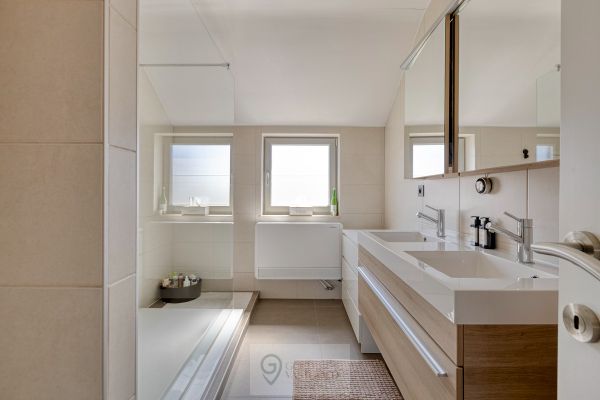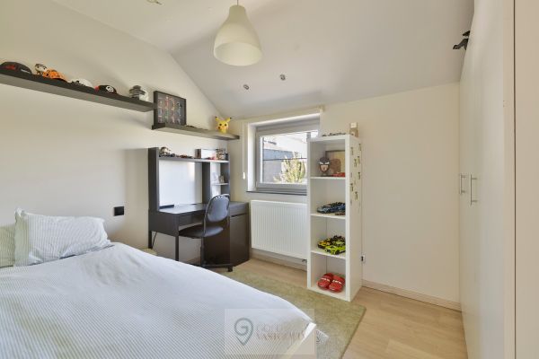 Op de verdieping zijn er drie slaapkamers en een moderne badkamer uitgerust met een inloopdouche. Daarnaast is er een zolderruimte onder het dak, perfect als extra opslagruimte.